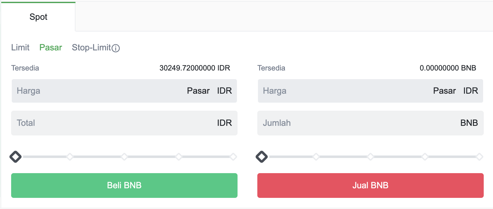 Ketika user ingin membuat sebuah pesanan pasar untuk membeli 31600 IDR. Setelah masuk ke dalam akun Tokocrypto, pilihlah pasar BNB yang diinginkan (contoh: BNB/IDR) dan pergilah ke halaman transaksi. Setelah itu, carilah label Market Order/Pasar, tentukan jumlah menjadi 31600 BNB, dan klik tombol Beli BNB.
